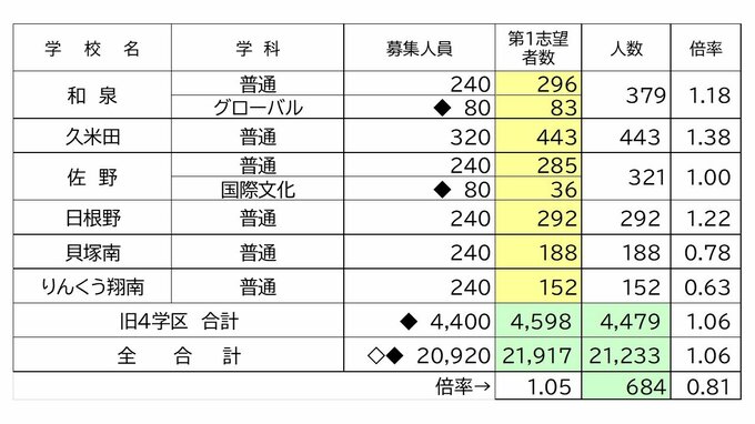 大阪府公立高校入試2024 志願倍率は北野1.5倍、茨木2.0倍、天王寺1.21倍に【令和6年度高校受験 進路希望調査】 毎日放送 2024年1月29日(月) 19:37 国内 学校別の一覧 懐風館0.59倍 泉陽1.49倍
