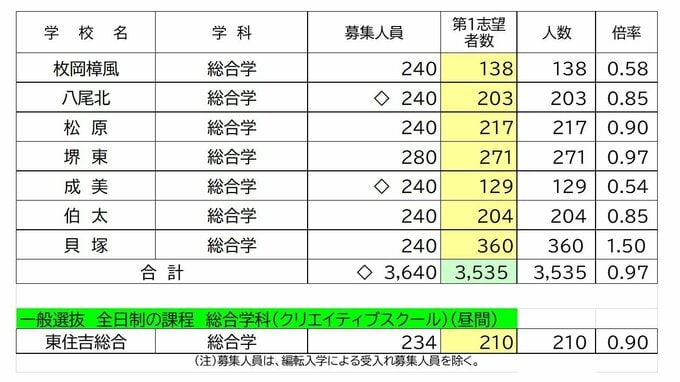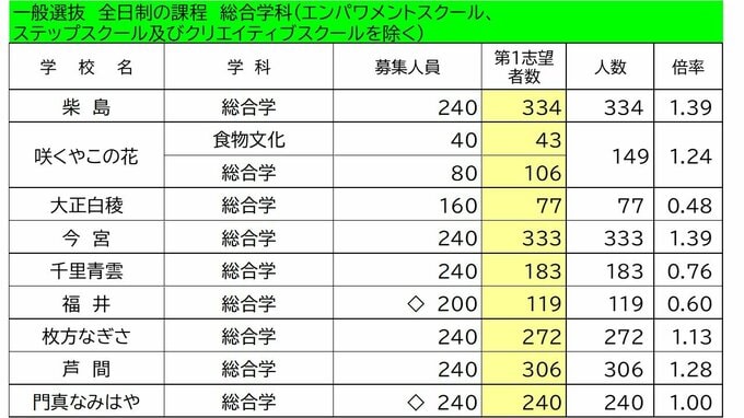大阪府公立高校入試2024 志願倍率は北野1.5倍、茨木2.0倍、天王寺1.21倍に【令和6年度高校受験 進路希望調査】 毎日放送 2024年1月29日(月) 19:37 国内 学校別の一覧 今宮(総合学科)1.39倍 貝塚(総合学科)1.5倍