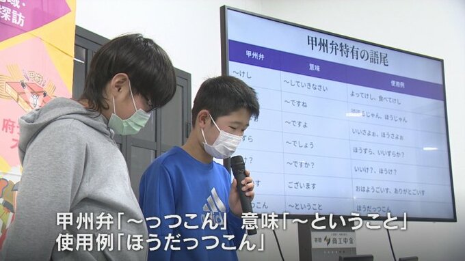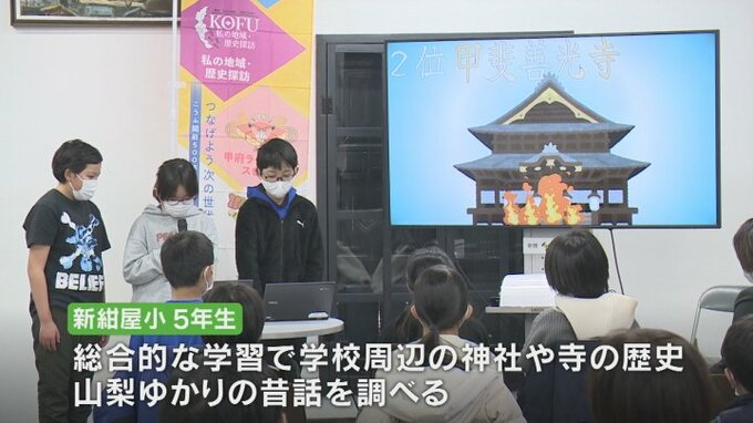 小学生が先生になった歴史発表会が甲府市で開かれ、児童たちは舞鶴城の歴史や甲州弁独特の発音などスライドも使いながら学習成果を発表しました。