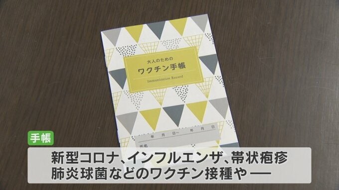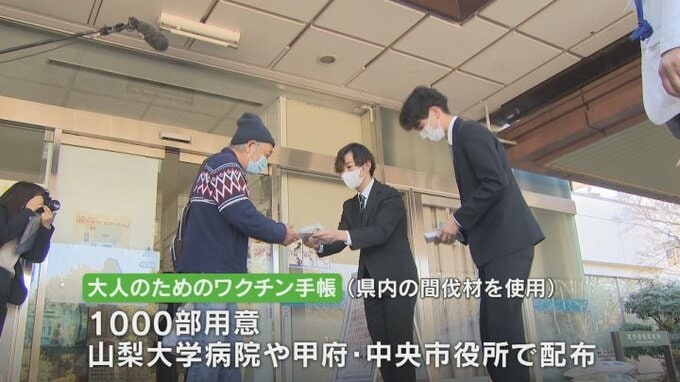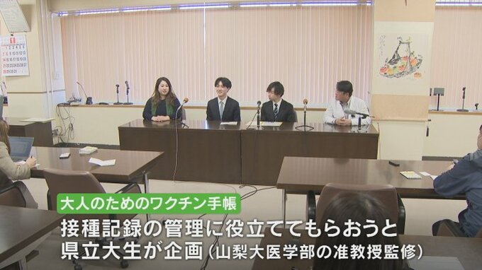 大人のためのワクチン手帳は、ワクチンの接種記録の管理に役立ててもらおうと県立大学の学生らが企画し、山梨大学医学部の准教授の監修のもと作成しました。