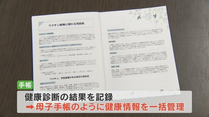 手帳には新型コロナやインフルエンザ、それに大人になってから発症しやすい帯状疱疹、肺炎球菌などのワクチン接種に加え、健康診断の結果を記録することができ、子どもの母子手帳のように健康にまつわる情報を一括で管理できる仕様になっています。