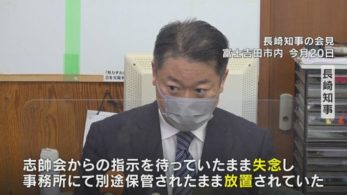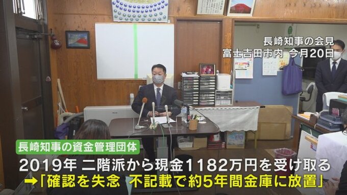 長崎知事の資金管理団体は2019年に自民党二階派からパーティー券販売のノルマを超えた分として現金1182万円を受け取り、「確認を失念」して収支報告書に記載せず、約5年間、事務所の金庫に放置していたと明らかにしました。