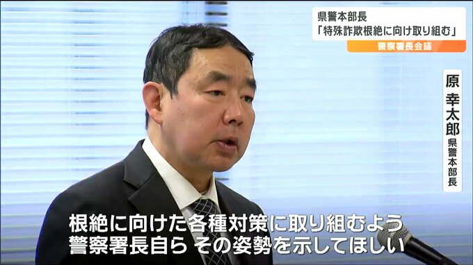 原幸太郎県警本部長:「全職員が特殊詐欺根絶の重要性、必要性を強く認識し一丸となって根絶に向けた各種対策に取り組むよう警察署長自らその姿勢を示してほしい」