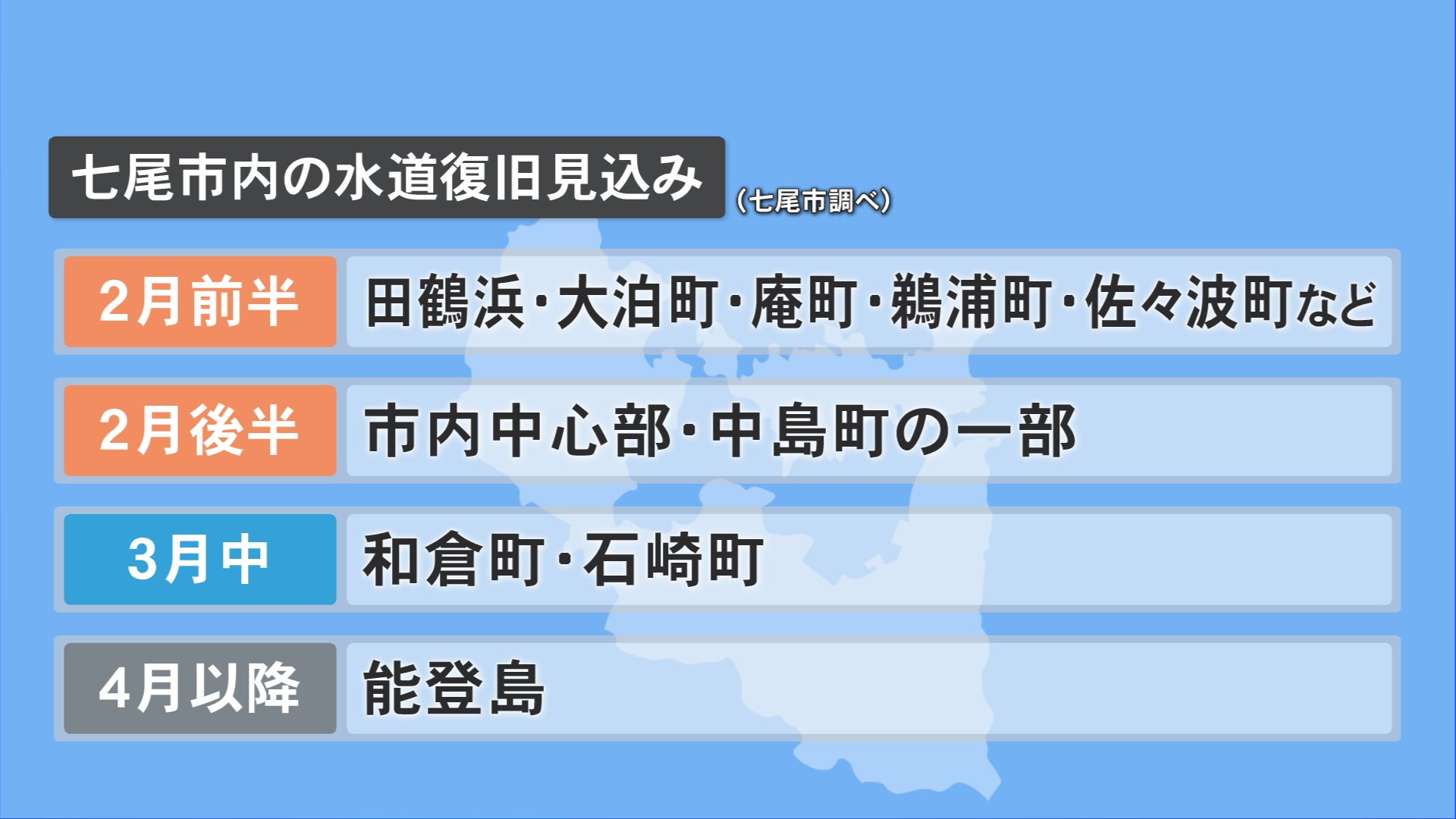市内中心部や中島町の一部などでは2月後半、和倉町や石崎町では3月中となっています。そして能登島は4月以降です。県の水道水が供給される地区の復旧は、2月後半以降に本格化します。