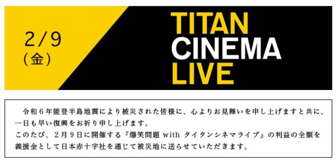 30日までに、爆笑問題ほか多数のお笑い芸人が参加する「タイタンシネマライブ」が、2/9(金)開催分の利益を能登半島地震の被災地支援のために寄付することが明らかになりました。