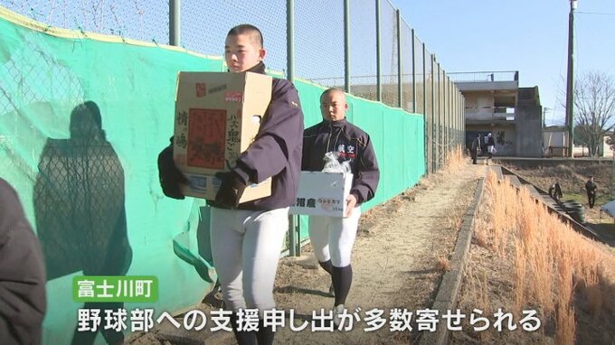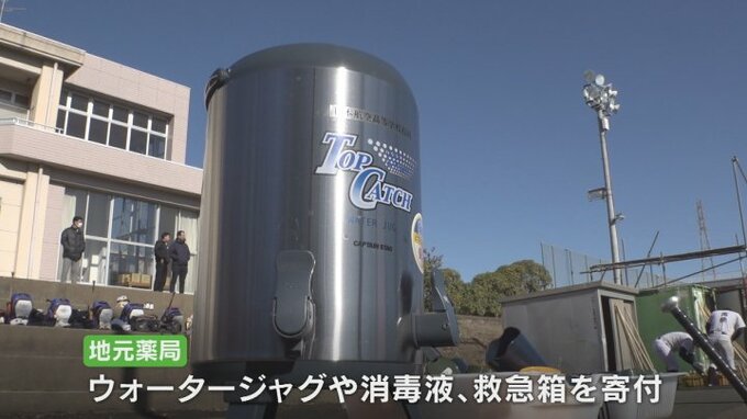 富士川町には野球部への支援の申し出が数多くの団体から寄せられ、この日は地元の薬局がウォータージャグや消毒液、救急箱など、練習に不足していたものを寄付しました。