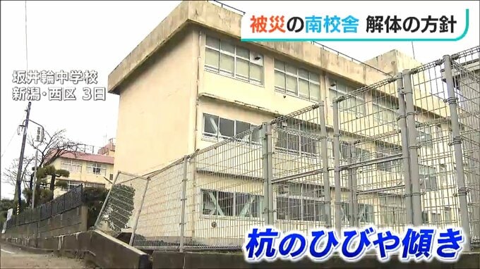 この方針は30日に開かれた新潟市議会の常任委員会で新潟市が示しました。坂井輪中学校の南校舎は建物を支える杭にひびが入ったり、傾いたりして使えなくなっていて、