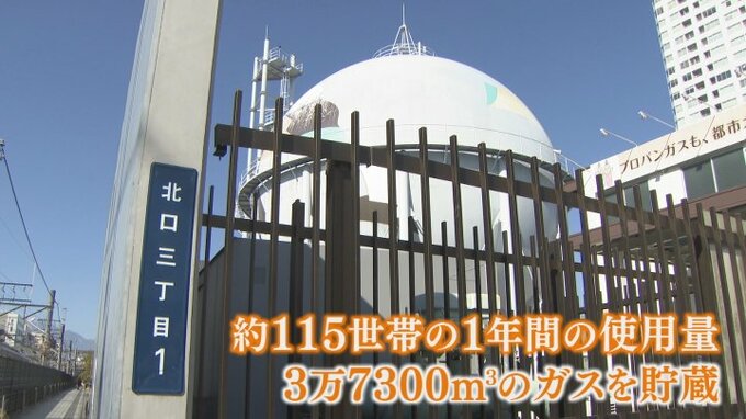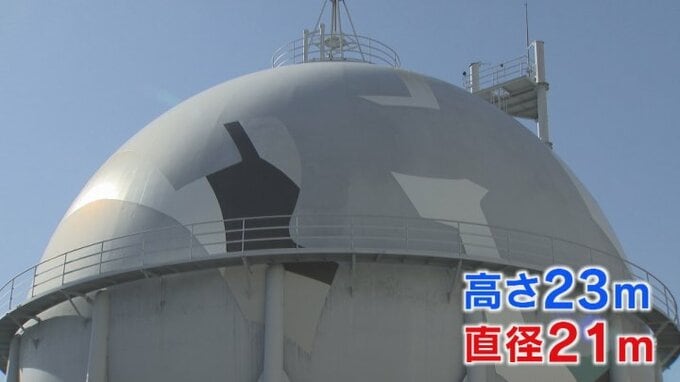 高さ23m、直径21mの球形のタンクで、約115世帯が1年間に使う量にあたる、3万7300㎥のガスを貯蔵することができます。