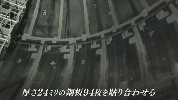 ガスホルダーは厚さ24mmの鋼板94枚を貼り合わせて、震度7クラスの大地震にも耐えられるよう頑丈に造られています。