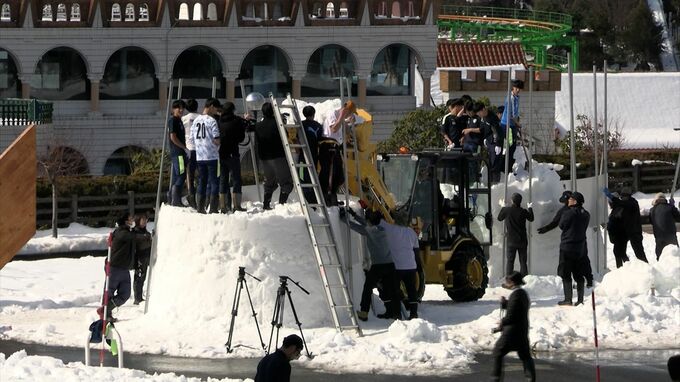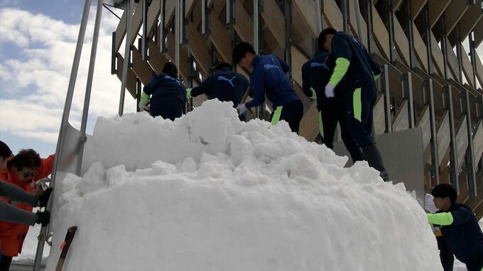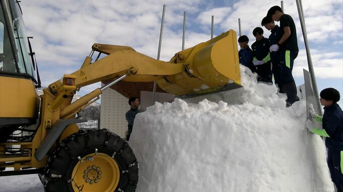 岡山市内ではお目にかかれない大量の雪に生徒たちは大興奮。重機で運んだ雪を足で踏み固めながら少しずつ雪を積み上げていきました。