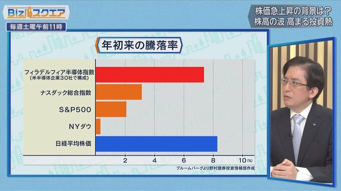 勢いが強くて私もびっくりした。もう少し時間がかかると思っていたが、いくつかプラスの要因があったと思う。一つが円安で、年初1ドル140円前後だったのが、今148円まで円安が進んでいる。これが輸出企業などの追い風になっていて、株価を押し上げていると思う。二つ目は、半導体産業の回復期待。2023年ようやく半導体世界の販売額が前年比でプラスに転じ始めていて、これまで2023年は半導体企業が大きな調整局面を迎えていた。人工知能だけが突出して良かったが、全体はそれほど良くなかった。