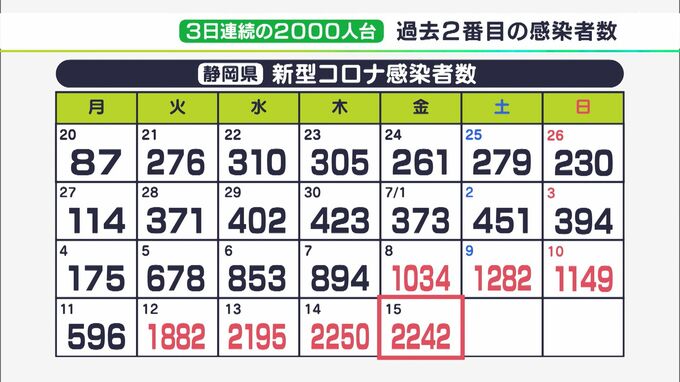 7月15日、静岡県内では新たに2242人が新型コロナウイルスに感染したことが分かりました。15日の2250人に続く過去2番目の感染者数です。2242人の感染者を自治体別にみますと、浜松市が613人、静岡市が603人、沼津市…