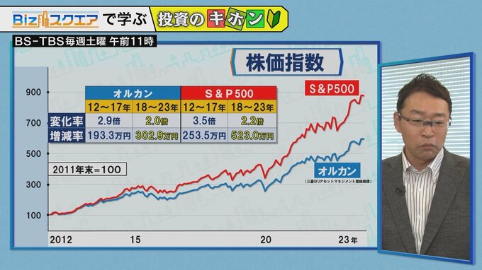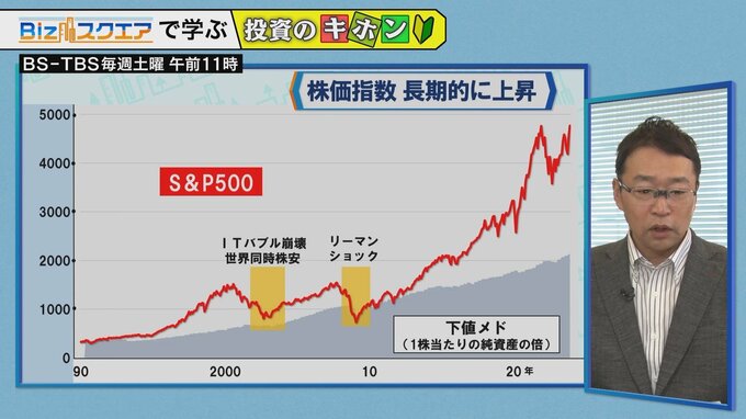 今後も9倍になるという保証はないが、それでも何倍かには増えてくれるはず。銀行に100万円を定期預金で30年間置いたら、定期預金の利息はほぼ0.2%。すると30年後にもらえる利息が4万8000円。100万円が104万8000円になる。(対してS&Pは)9倍に膨れ上がっていく。この通りになるわけでなく、下がるかもしれないし、もっと上がるかもしれない。確定していないのが株の難しさだが、いずれにしても長期間では上がっていくと考えてよいと思う。