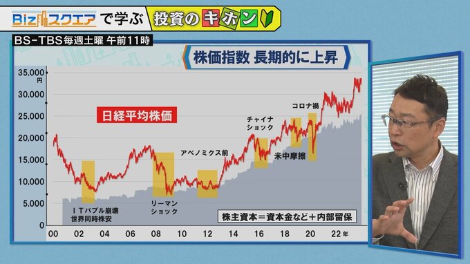 この先どう考えたらいいかということを見ていきたいと思う。日経平均が上がったり下がったりしている。(特に)下がったところには、坂道があり、ここで、大体下げ止まっている。何かというと、株主資本、いわゆるPBR(株価純資産倍率)1倍の水準。すなわち、株価というのは時価。この坂道は簿価の方、帳簿上の企業の価値。簿価と時価が一致するところまで下がると株価は下げ止まる。それより株価が下がってくると割安感が出てくる。それ以上売る人が減って、「もう割安だ」と買う人が出てくる。株主資本はどういうものかというと企業が決算をしたら、配当を払って残りは株主資本に積み上げていく。利益剰余金、これがいわゆる内部留保。長期的にはこの坂道は右上がり。時々、リーマン・ショックのときやチャイナショックみたいに、多くの企業が赤字に陥った年は坂道が一時的に右下がりになっているが、また黒字回復すると、右上がり。だから長期的には右上がり。