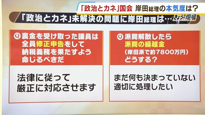 ――岸田総理は、『裏金を受け取った議員は修正申告をして納税義務を果たすよう命じるべき』という問いに対しては、「法律に従って厳正に対応させます」と答えています。また、「派閥を解散したら、派閥の繰越金(岸田派は約7800万円)をどうするのか」という質問に対しては、「まだ何も決まっていない。適切に処理したい」と答えています。