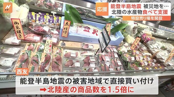 記者「食べて応援と書かれたこちらのコーナー、石川県産のぶりがたくさん並んでいます」脂の乗った石川産の天然寒ぶりに、富山産のうるめいわし。大手スーパーの西友ではきょうから、被災地を支援するため北陸の水…