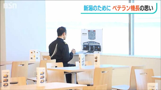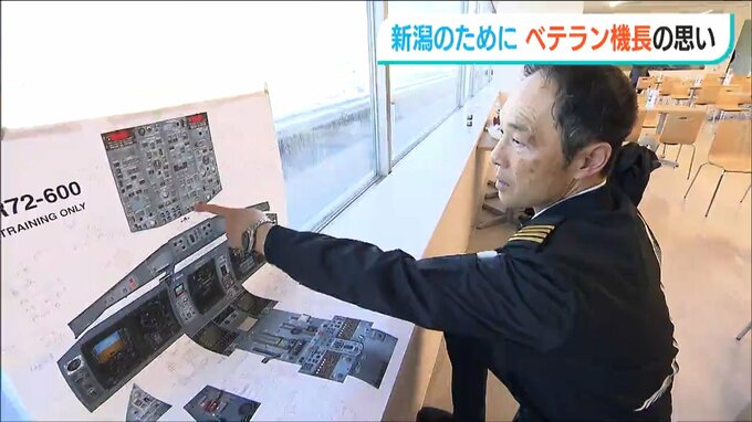 トキエアに8人いる機長のうちの1人、宮崎雄一郎さん(57歳)が、新潟空港ターミナルビル3階にオープンしたばかりの多目的スペースの一番奥で、コクピットを模した訓練用ポスターを使った運航イメージトレーニングをしていました。
