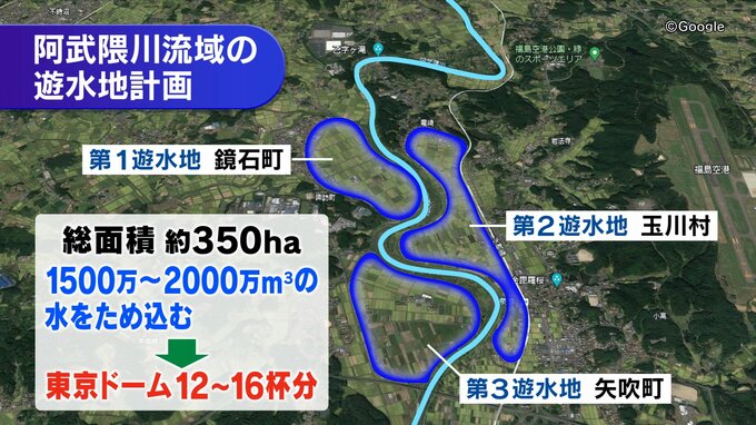 あらためて、この遊水地の計画についてまとめました。国が今計画を進めているのが、鏡石町、矢吹町、玉川村にまたがる遊水地の整備です。遊水地の総面積はおよそ350ヘクタールで、1500万から2000万立方メートルの水をため込むことができます。東京ドームで例えると、12杯から16杯分の水の量です。