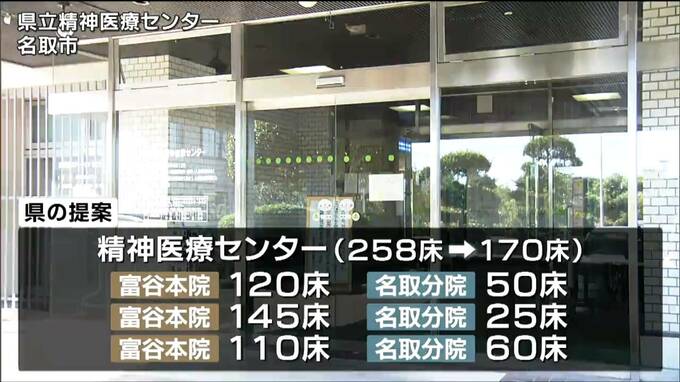 このうち、精神医療センターについて、おととい県は、258床ある病床数を170床に減らした上で、富谷の本院に120床、名取の分院に50床とする案、富谷に145床、名取に25床とする案、富谷に110床、名取に60床とする案の3つをセンター側に提示しました。