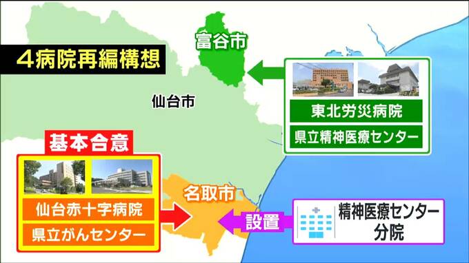 県の4病院再編構想は仙台赤十字病院と県立がんセンターを統合して名取市に東北労災病院と県立精神医療センターを併設して富谷市に移転し名取市に分院を置くものです。