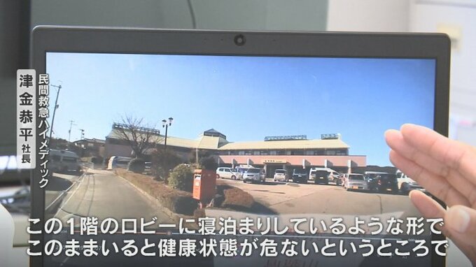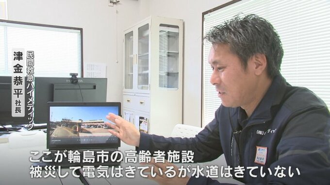 「ここが輪島市の高齢者施設。被災して電気はきているが水道は来ていない。この1階のロビーに寝泊りしているような形で、このままいると健康状態が危ないというところで利用者を金沢市内に搬送した」