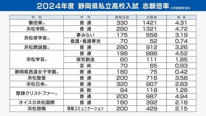 浜松学院は、学校別では最も高い4.72倍、磐田東も4.31倍と高倍率です。浜松修学舎は夢みらいが3.19倍、浜松開誠館は3.26倍、浜松学芸は普通科が4.52倍と学科別では3番目に高い倍率になっています。西遠女子学園は0.42倍、浜松聖星は3.58倍、浜松日体は2.83倍、聖隷クリストファーは普通科が学科別では最も高い4.94倍となりました。また、オイスカ浜松国際は2.18倍、浜松啓陽は2.15倍となっています。