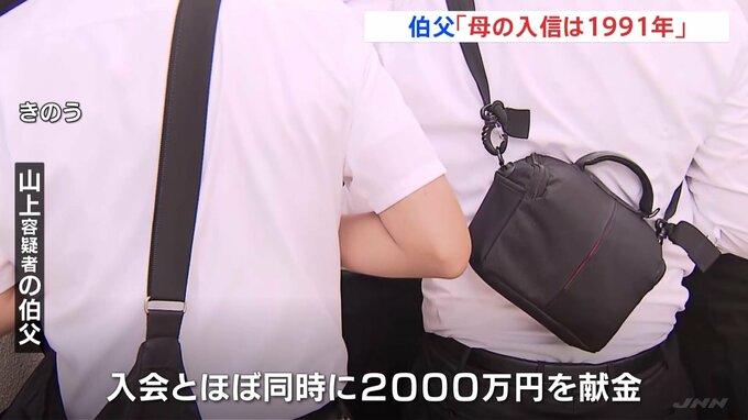 安倍元総理が殺害された事件で、逮捕された山上容疑者の母親について伯父が旧統一教会の説明とは異なる1991年に入信していたことを明らかにしました。奈良市の無職・山上徹也(やまがみてつや)容疑者(41)は7月8…