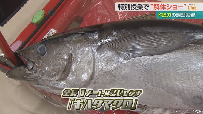 子どもたちがくぎ付けになっているのは全長1メートル20センチ、きのう水揚げされたばかりの「キハダマグロ」です。