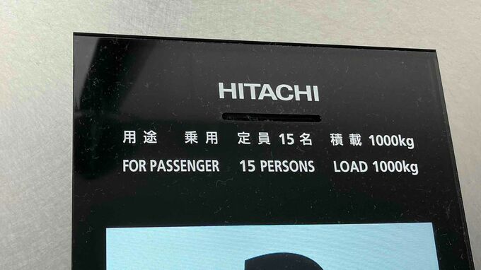 ならばその真偽を確かめてみよう。。。弊社は地上5階地下1階建てで、エレベーターは2基あります。そのエレベーターの内部に表示されているのは、「HITACHI」の文字(【画像④】)。
