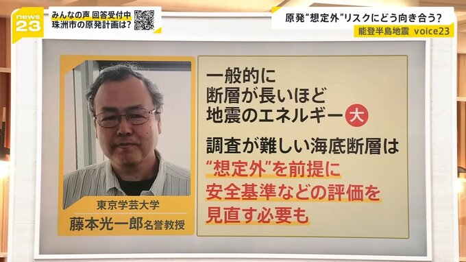 これを受けて、東京学芸大学の藤本光一郎 名誉教授は、「一般的に、断層の長さが長いほど、地震のエネルギーは大きくなる。調査が難しい海底断層は、“想定外を前提”に、安全基準などの評価を見直す必要もある」と話しています。
