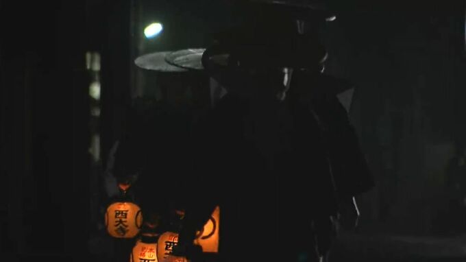 昔ながらの菅笠、手甲脚半に草履履きの使者たちは霧雨の降る夜道を提灯のあかりを頼りに、原木がある芥子山の無量寿院まで4キロほどの道のりを無言で歩きます。