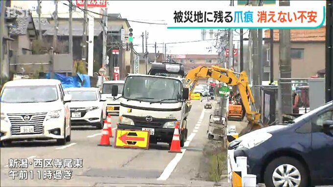 【記者リポート】「新潟市 西区 善久地区です。道路の亀裂に垂れ下がった電線、こうした光景は発災当時と変わっていません。圧倒的に泥が少なくなっていて今は乾いた砂になっています」