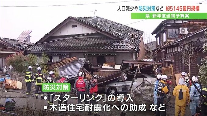 また能登半島地震を踏まえた防災対策としては大規模災害後の情報共有体制を強化するため人工衛星を使ったインターネットサービス「スターリンク」の導入、木造住宅の耐震化に対する助成などが計上されています。