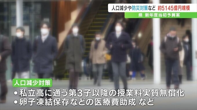 このうち県が重要施策に掲げている人口減少対策としては私立高校に通う第3子以降の授業料の実質無償化や保険適用外の卵子の凍結保存などの医療費助成などが盛り込まれています。