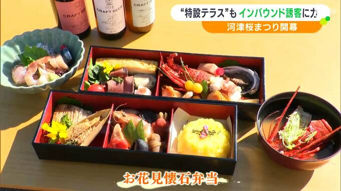 実行委員会は今回、河津桜を見下ろせる特設テラスを初めて設置。テラスでは、ほとんどの食材を河津産でそろえたお花見懐石弁当を味わえます。このほか、地元のクラフトビール、日帰り温泉の入浴券などを含めて、一人2万5,000円で利用することができるプランを用意しました。