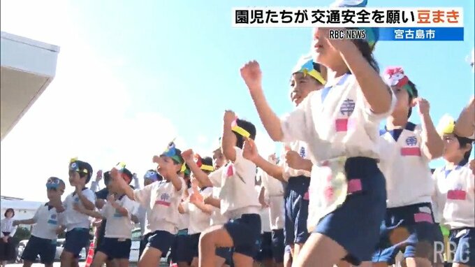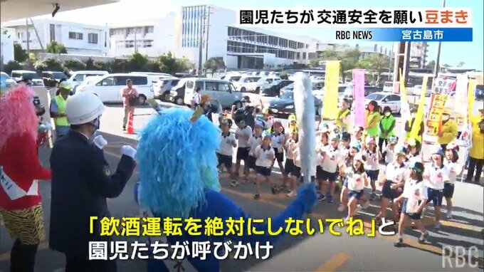 宮古島警察署で行われた豆まきには、近くの幼稚園に通う園児と交通安全協会の会員や警察署員が参加しました。