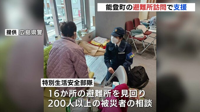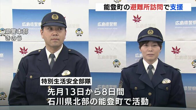 広島県警本部の生活安全部に所属する警察官3人は、「特別生活安全部隊」として先月13日から20日までの間、石川県北部の能登町で活動しました。3人は16カ所の避難所を訪問し、200人以上の被災者の相談に応じたほか、見回り活動をしました。