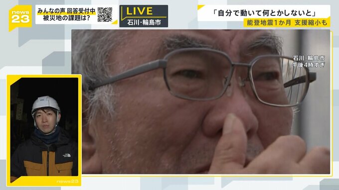 そして、ビニールハウスで避難している保靖夫さんは、「自宅が全壊しているという状況で、未だに家の状況をきちんと確認できていない。1か月経った今も、この先のことはまだ考えていない。考えるのをやめている」というふうに話していました。そういった方も多いかと思います。