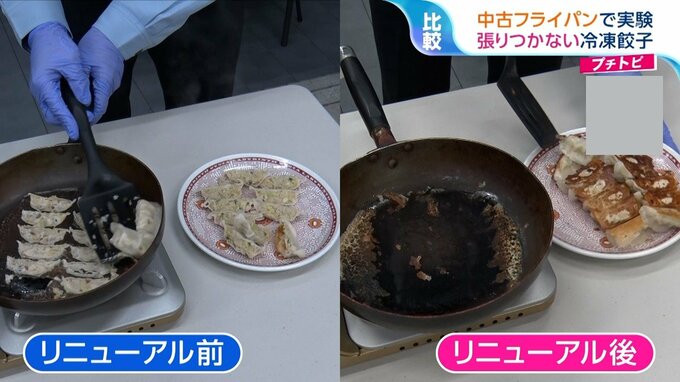 実際に送られてきた、コーティングがはげたかなり使い込まれたフライパンで、リニューアルの前と後のギョーザを焼いてみると・・・