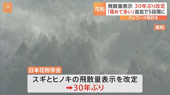 近年、スギ花粉などの飛散量が増えていることを受けて、飛散量の表示方法が30年ぶりに改定されました。日本花粉学会は、去年12月、スギとヒノキの飛散量の表示について、1日の1平方センチメートル当たりの飛散量が1…