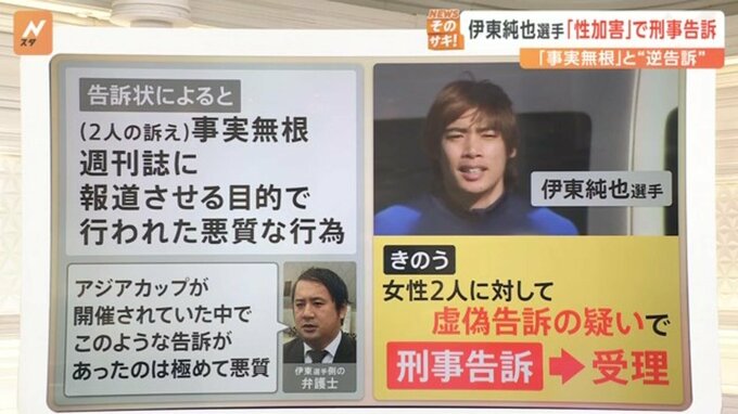 伊東選手側の告訴状によりますと、「(女性2人の訴えは)事実無根。週刊誌に報道させる目的で行われた悪質な行為」さらに伊東選手の弁護士は「アジアカップが開催されていた中でこのような告訴があったのは極めて悪質」と話しています。