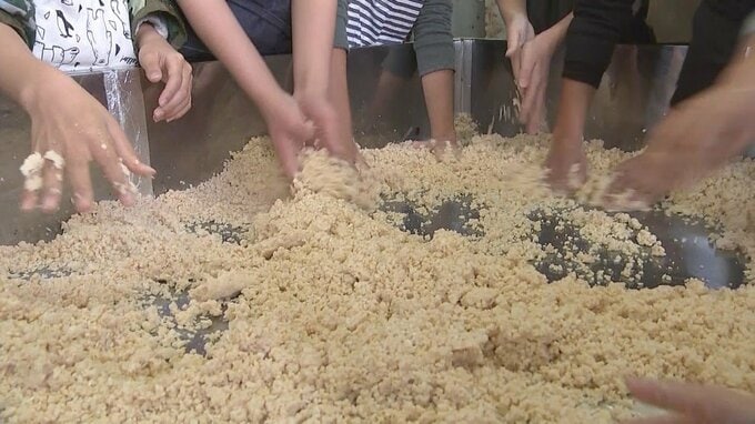 児童が仕込んだおよそ120キロの味噌は半年ほど熟成させた後、秋に行われる調理実習で使いみんなで味わうということです。