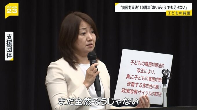 「この10年、良くなった事がたくさんある。ありがとうございました。本当にたくさん給付金が増えたり税制改革があったり、後ずさりしない対策がたくさんできました。しかし足りないんです。子ども貧困対策のゴールは何だったのか、すべての子どもが幸せな日本を作ることだったはずです。まだ全然そうじゃない」