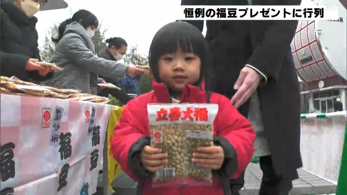 このイベントは、野村煎豆加工店とテレビ高知が40年ほど前から行っていて、節分の恒例行事となっていて朝から長い行列ができていました。今年は、鬼の面が入ったものなどおよそ300人分が用意されました。鬼のコスプレで気合十分で列に並んだ男の子は豆を片手に「おうちで鬼は外、福はうちをします」。赤ちゃんを抱っこしたお母さんは「家族が幸せになるような節分にしたいです」と笑顔で話してくれました。