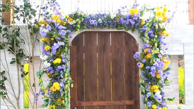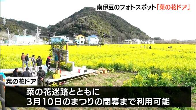 静岡県南伊豆町の菜の花畑では、まつりの開催に合わせ、フォトスポットの「菜の花ドア」の飾り付け作業が行われました。