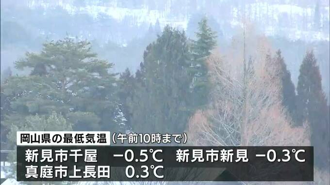 けさ8時頃の岡山県北・真庭市蒜山では先週からの雪に昨夜からの雪が降り積もり一面真っ白になりました。午前9時までの最低気温は新見市千屋でー0.5℃、新見市新見でー0.3℃と氷点下まで冷え込むところもありました。