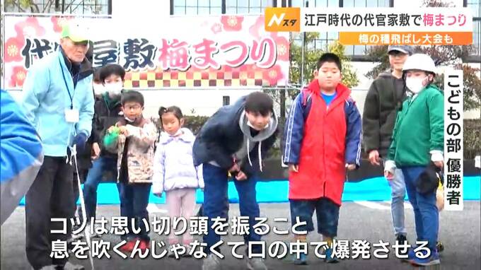 祭りの初日となる2月4日は、「梅の種飛ばし大会」も開かれ、老若男女問わず、多くの人が口から吹いた種の距離を競いました。