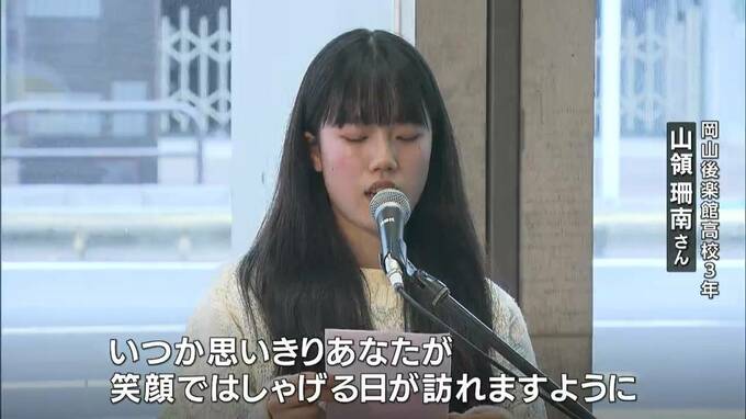 (岡山後楽館高校3年 山領珊南さん)「あなたの幸せを、あなたの夢を応援している人たちがここにいます。いつか思いっきりあなたが笑顔ではしゃげる日が訪れますように。岡山の友達」