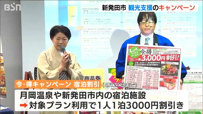 新発田市で始まったのは「今・得(いまとく)キャンペーン」の宿泊割引で期間は4月21日までとなります。月岡温泉や新発田市内の宿泊施設で対象のプランを利用した場合1人1泊3000円を割り引きます。