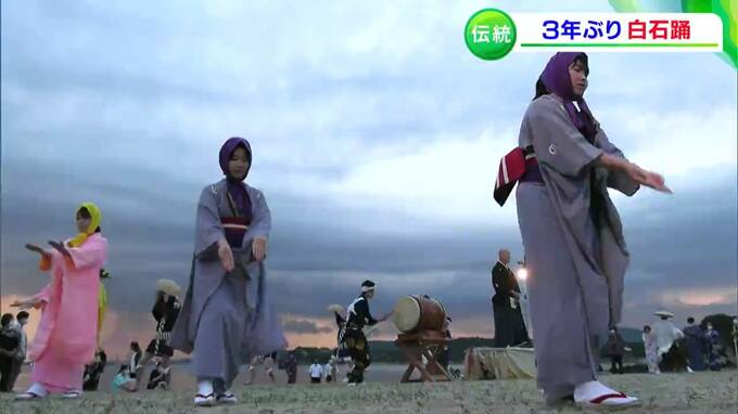 白石踊とは、源平水島合戦の死者の霊を弔うために始まった、と言われる伝統行事です。砂浜に人々が集い、ひとつの音頭に合わせてさまざまな踊りを披露するのが特徴で、他に類をみない形式であることから、国の重要無形民俗文化財に指定されています。しかしここ2年は新型コロナの影響で中止となっていました。